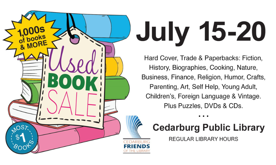 Cedarburg Friends of the Library are having their BIG Used Book Sale starting this coming week on Monday, July 15 until Saturday, July 20! Drop by and browse the huge selection of Used Books, DVDs, CDs and Puzzles. Our Friends say they have "Books galore!"